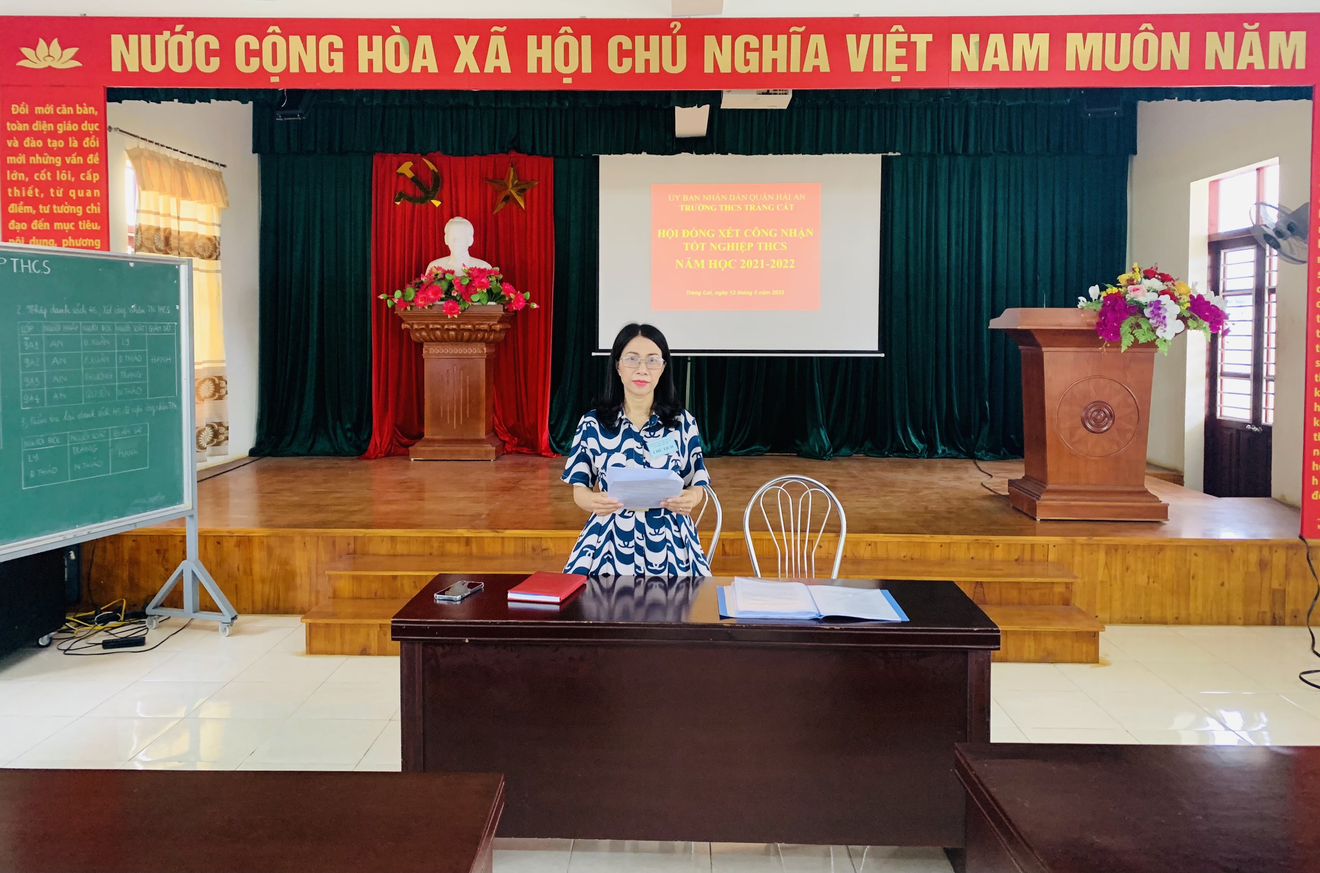 Thực hiện Quyết định số 1186/QĐ-UBND ngày 10/5/2022 của UBND quận Hải An về việc thành lập Hội đồng xét công nhận tốt nghiệp THCS trường THCS Tràng Cát năm học 2021-2022, 7h00 ngày 12/5/2022, tại Hội đồng xét công nhận tốt nghiệp THCS Tràng Cát đã tiến hành xét công nhận tốt nghiệp cho học sinh lớp 9 năm học 2021-2022.