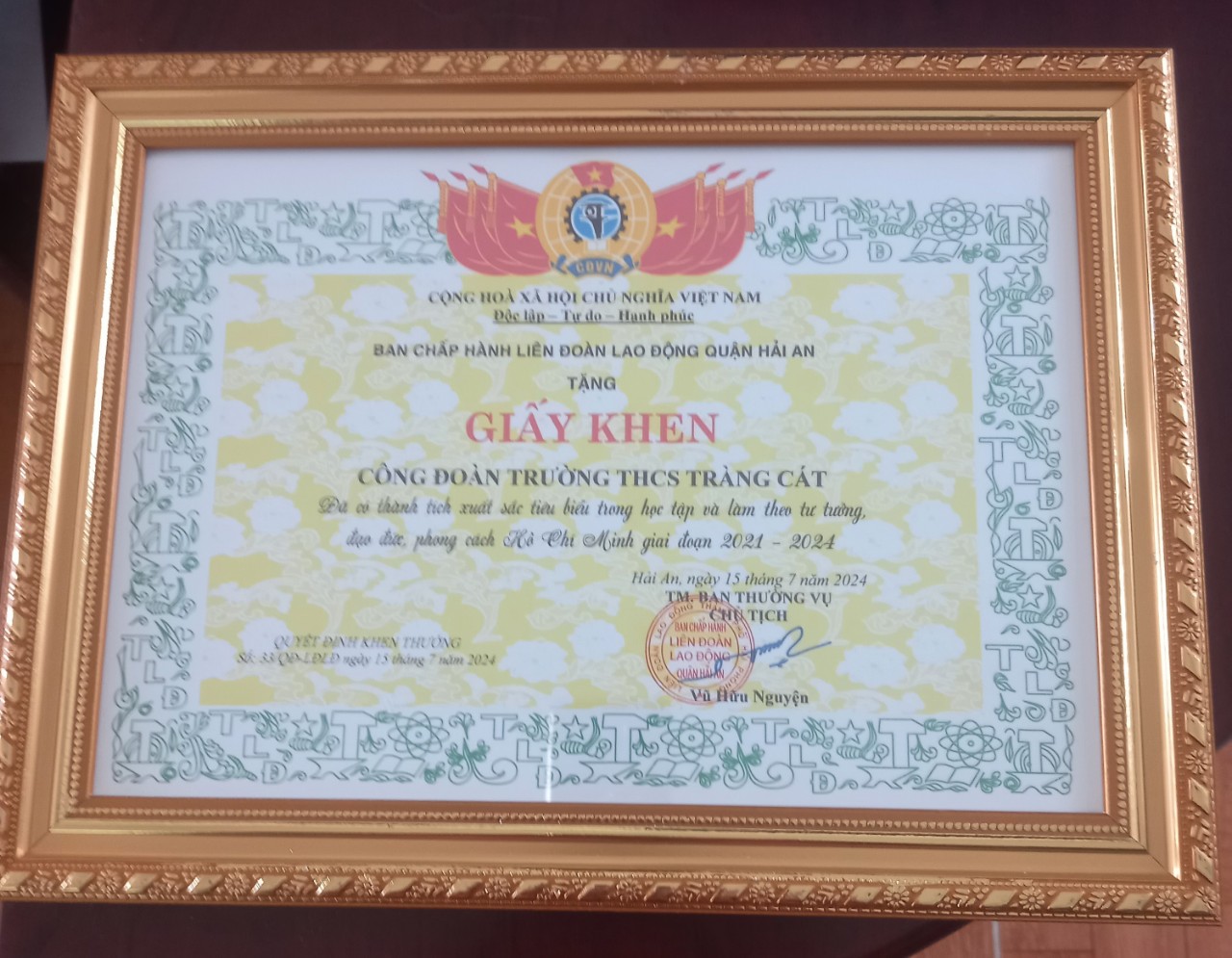 Tại Hội nghị Công đoàn trường THCS Tràng Cát rất vinh dự được nhận giấy khen vì đã có thành tích xuất sắc tiêu biểu trong học tập làm theo tư tưởng đạo đức phong cách Hồ Chí Minh giai đoạn 2021-2024.