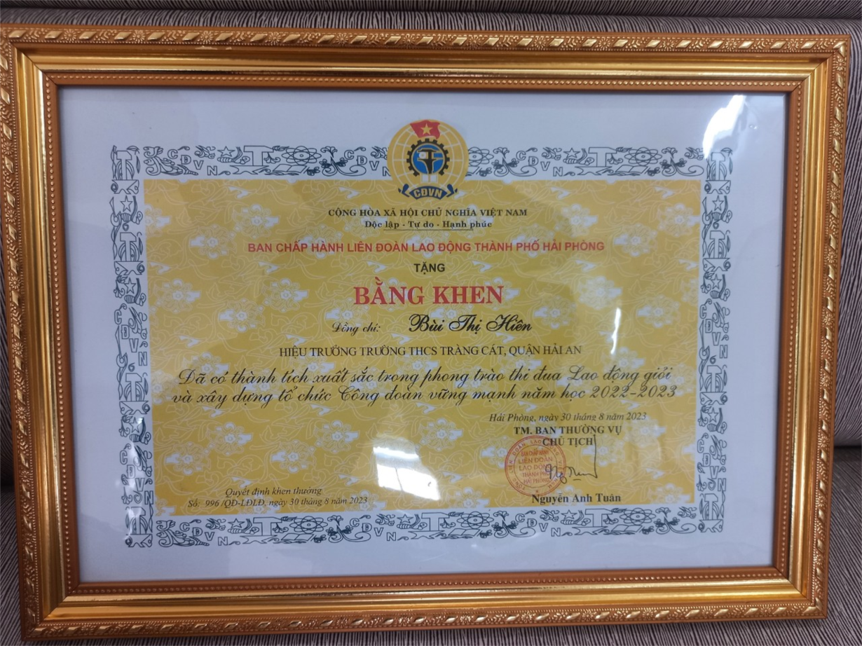 + Trường THCS Tràng Cát được nhận Bằng khen của Tổng LĐLĐ Việt Nam