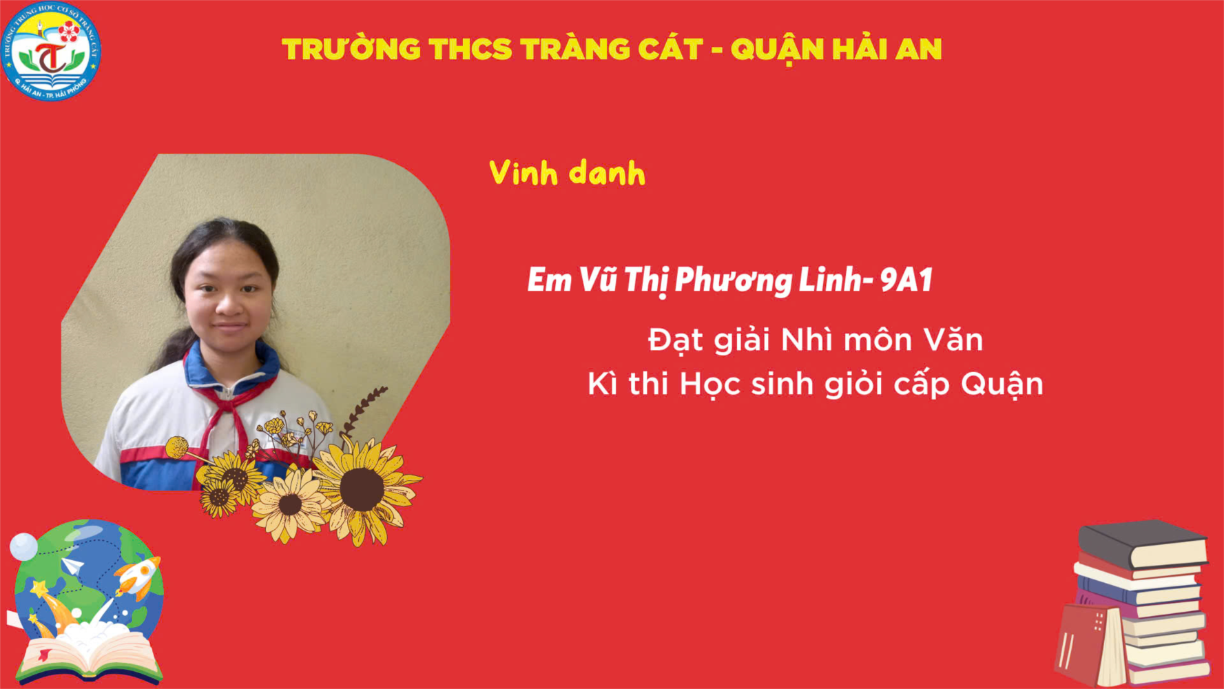 Các em là HS tiêu biểu đại diện cho 176 HS khối 9 của nhà trường tham dự kì thi học sinh giỏi cấp Quận. Năm nay, trường THCS Tràng Cát có 27 học sinh dự thi với 6 môn thi là: Toán, KHTN, Tiếng Anh, Ngữ Văn, Lịch sử&Địa lý, GDCD.