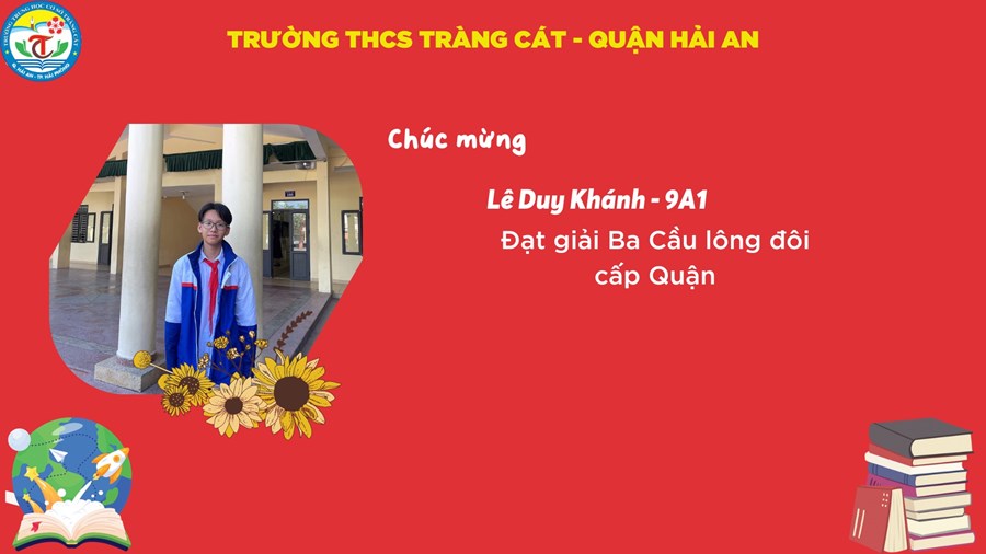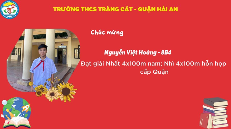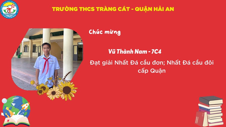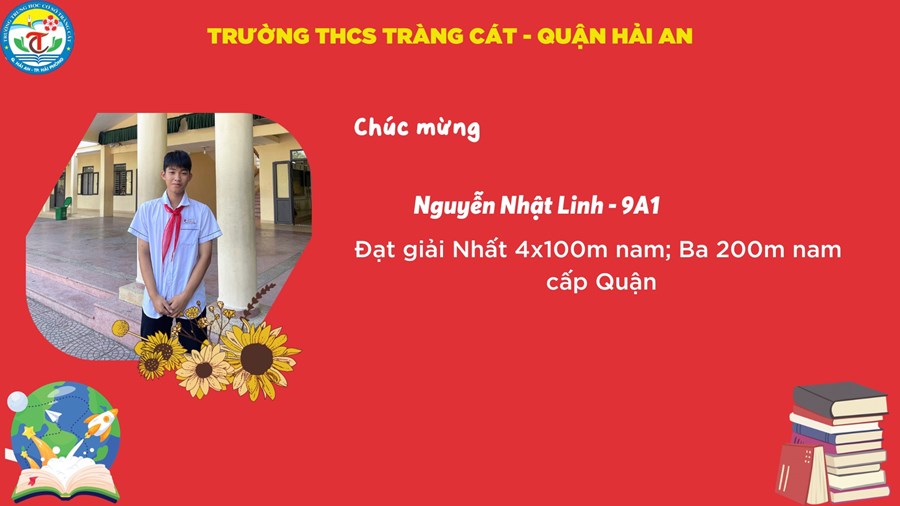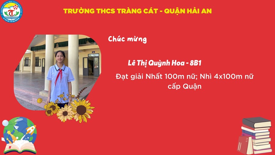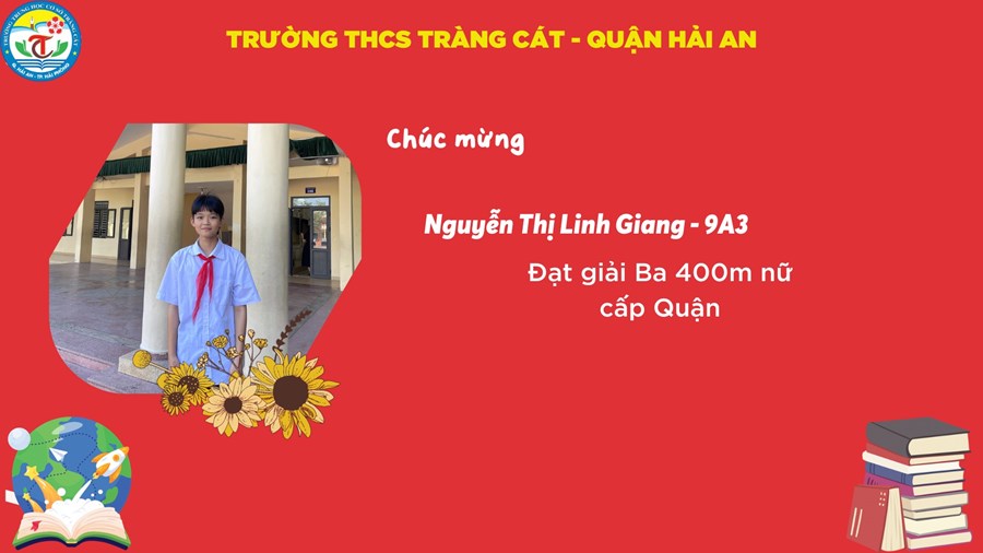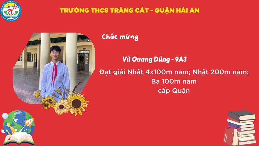 Trong kì thi HSG TDTT cấp quận năm học 2023-2024 diễn ra vào ngày 28,29/10/2023, trường THCS Tràng Cát có 19 em học sinh dự thi và thật tự hào nhà trường đã đạt 17 giải. Trong đó: 06 giải Nhất, 02 giải Nhì, 09 giải Ba.