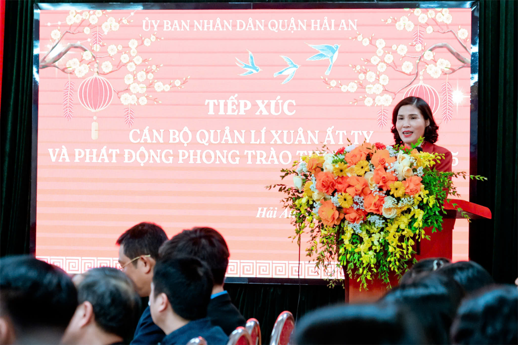 Đồng chí Trần Thị Kim Oanh - Phó chủ tịch UBND thay mặt lãnh đạo quận phát biểu tại buổi gặp mặt. Chúc toàn thể các đồng chí lãnh đạo cấp trên, các cán bộ quản lý, công chức, viên chức, người lao động trong Quận một năm mới sức khỏe, hạnh phúc và thành công. Giáo dục Hải An xin ghi nhận những lời chúc tốt đẹp của các đồng chí lãnh đạo cấp trên. Mong rằng những tình cảm, sự quan tâm của các cấp lãnh đạo sẽ đưa các phong trào giáo dục của Hải An thành công và tiến xa hơn.
