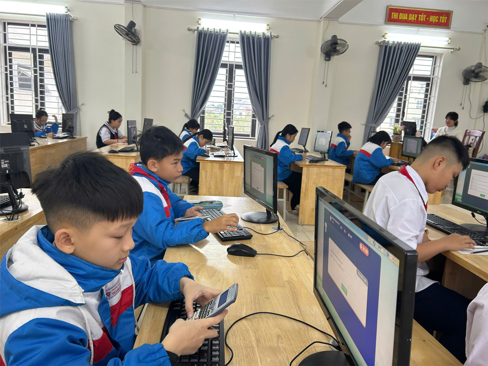 Tại phòng Tin nhà trường, công tác tổ chức được các nhà trường chuẩn bị chu đáo về đường truyền internet và thiết bị máy tính. Các em học sinh tham gia với tâm thế hào hứng nhưng cũng đầy quyết tâm. Khác với các bài kiểm tra trên giấy truyền thống, Đấu trường VioEdu mang đến trải nghiệm thi trực tuyến hấp dẫn, kết hợp giữa kiến thức Toán học và kỹ năng công nghệ thông tin (đối với cấp THCS)