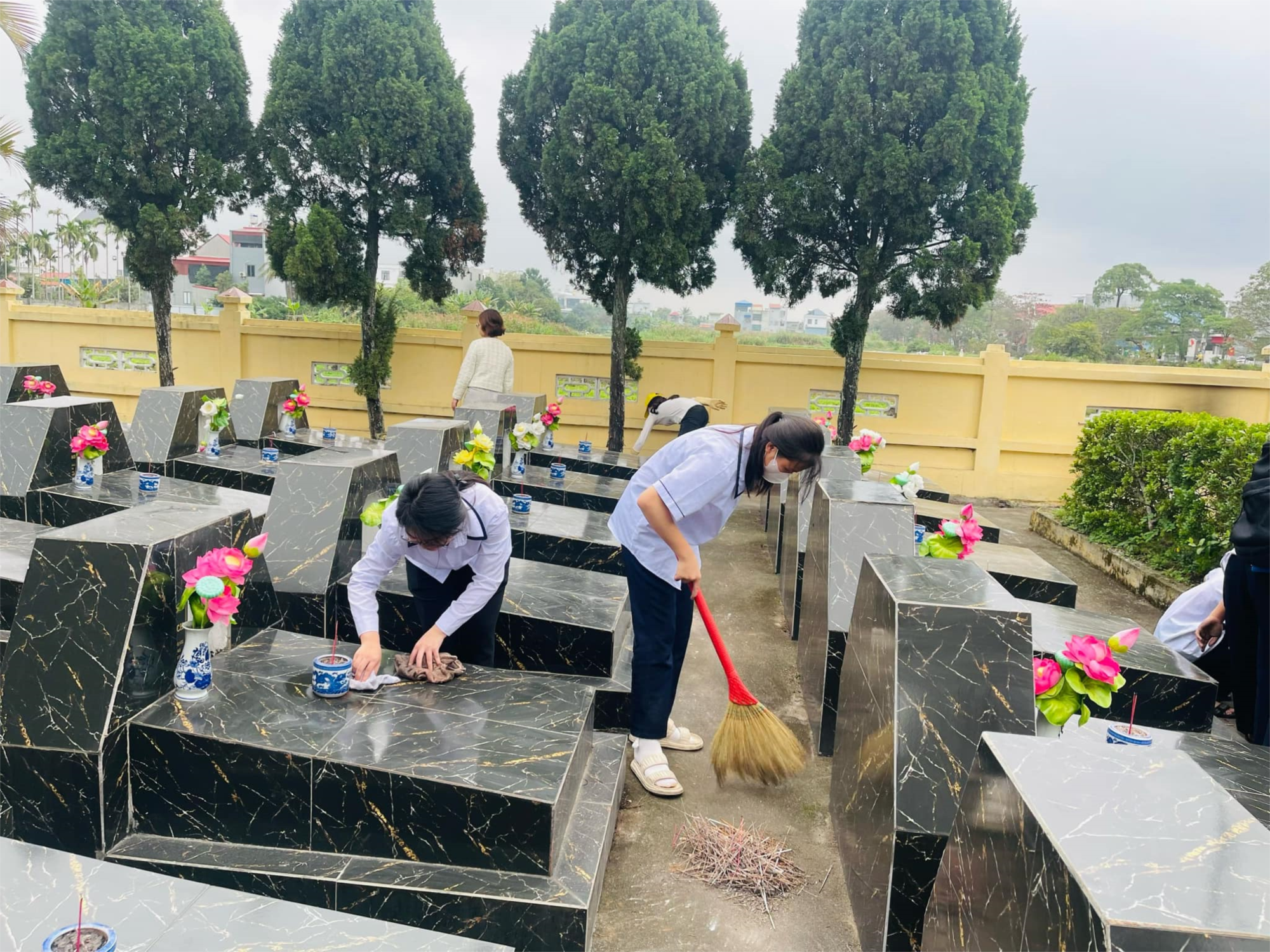Trong không khí phấn khởi chào mừng kỷ niệm 94 năm ngày thành lập Đảng cộng sản Việt Nam và chào đón xuân mới Giáp Thìn năm 2024. Sáng ngày 04/02/2024, học sinh và đoàn viên giáo viên nhà trường tham gia chăm sóc, dọn vệ sinh Nghĩa trang liệt sĩ phường hưởng ứng ngày Chủ Nhật xanh.