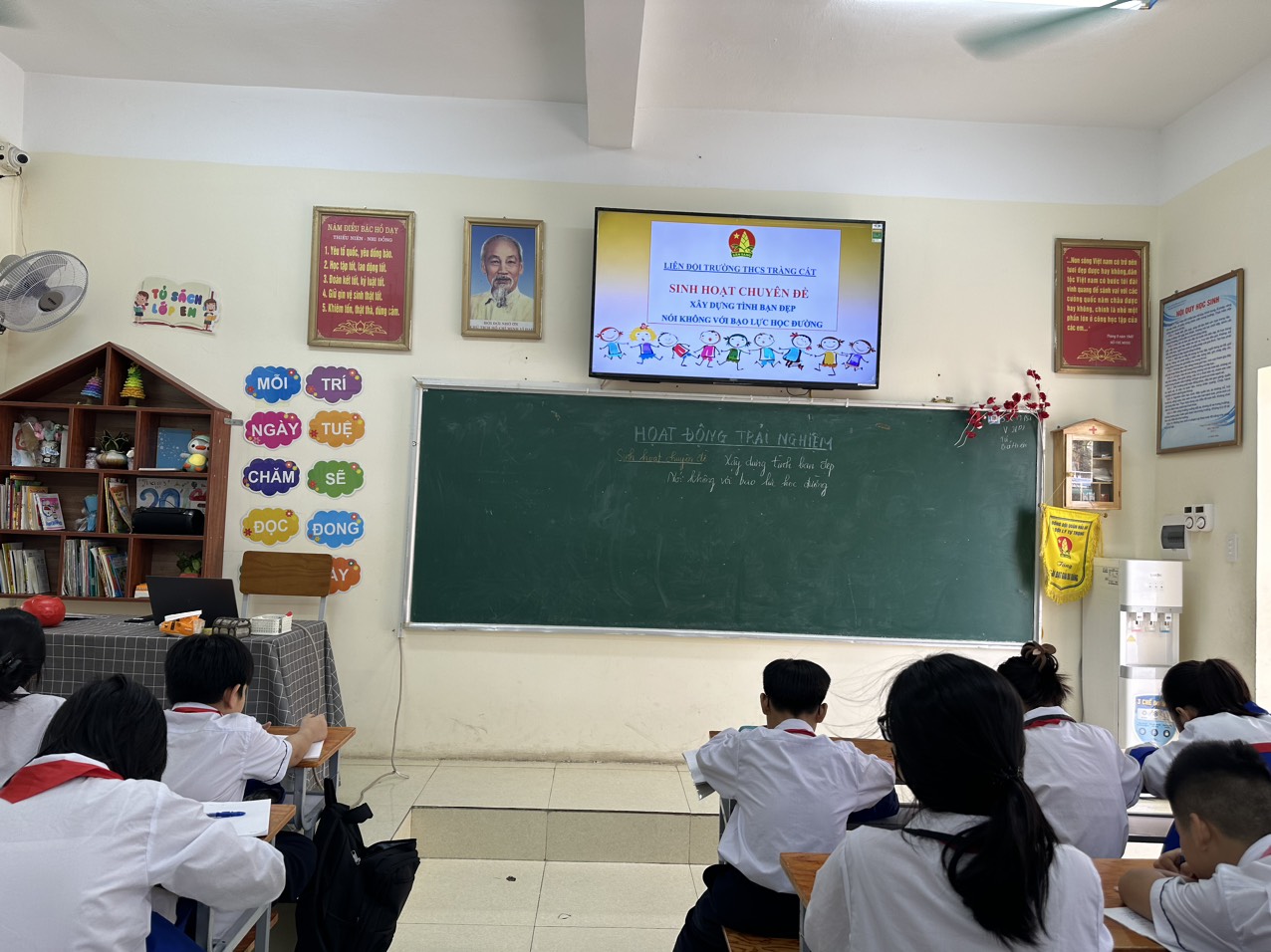 Hiện nay bạo lực học đường đang là một vấn đề vô cùng nhức nhối và ngày càng trở nên đáng lo ngại. Bởi lẽ nó gây ảnh hưởng xấu và có tác động sâu sắc đối với các thế hệ học sinh. Nhận thấy tầm quan trọng của vấn đề này, sáng ngày 29/3/2024, trong tiết hoạt động trải nghiệm và ngoài giờ lên lớp các Chi đội thuộc Liên đội trường THCS Tràng Cát tổ chức sinh hoạt chuyên đề: "Xây dựng tình bạn đẹp, nói không với bạo lực học đường"