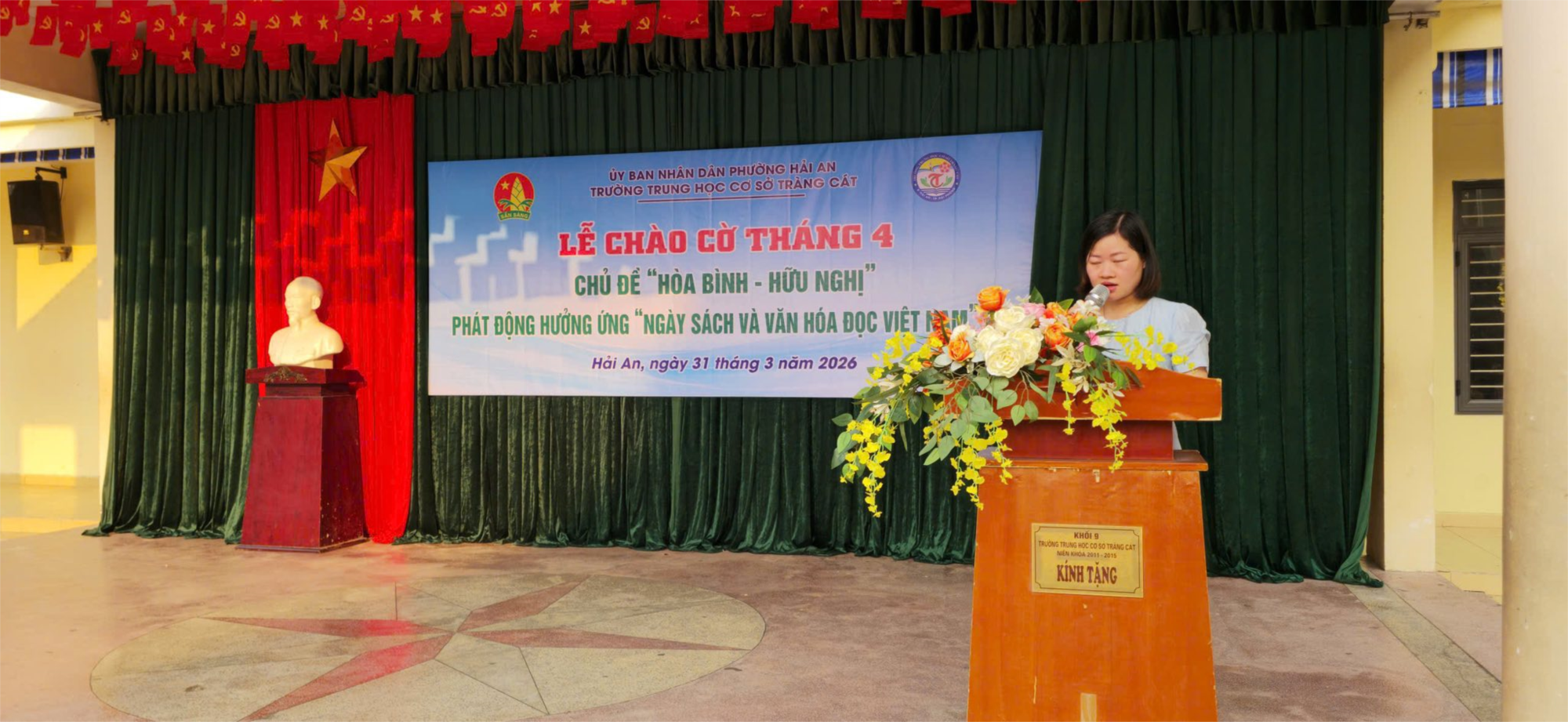 Chiều ngày 31/3/2026, tại sân trường, Trường THCS Tràng Cát đã tổ chức Lễ chào cờ tháng 4 với chủ điểm “Hòa bình – Hữu nghị” cùng hoạt động phát động hưởng ứng Ngày Sách và Văn hóa đọc Việt Nam 21/4. Buổi lễ có sự tham dự của Ban Giám hiệu, các thầy cô giáo và 968 học sinh của 20 lớp trong toàn trường.