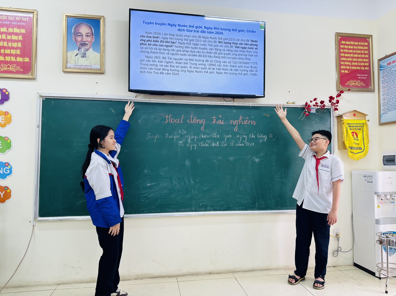 Ngày 22/3/2024, trong tiết sinh hoạt lớp, hoạt động trải nghiệm, các lớp đã tổ chức tuyên truyền Ngày Nước thế giới, Ngày Khí tượng thế giới, Chiến dịch Giờ trái đất năm 2024 tới học sinh. Thông qua hoạt động trên, cán bộ, giáo viên, nhân viên và học sinh nhà trường đã đẩy mạnh việc bảo vệ và sử dụng hiệu quả các công trình nước sạch trong nhà trường; nâng cao tinh thần tiết kiệm nước, sử dụng nguồn nước có hiệu quả, chống lãng phí tài nguyên thiên nhiên.