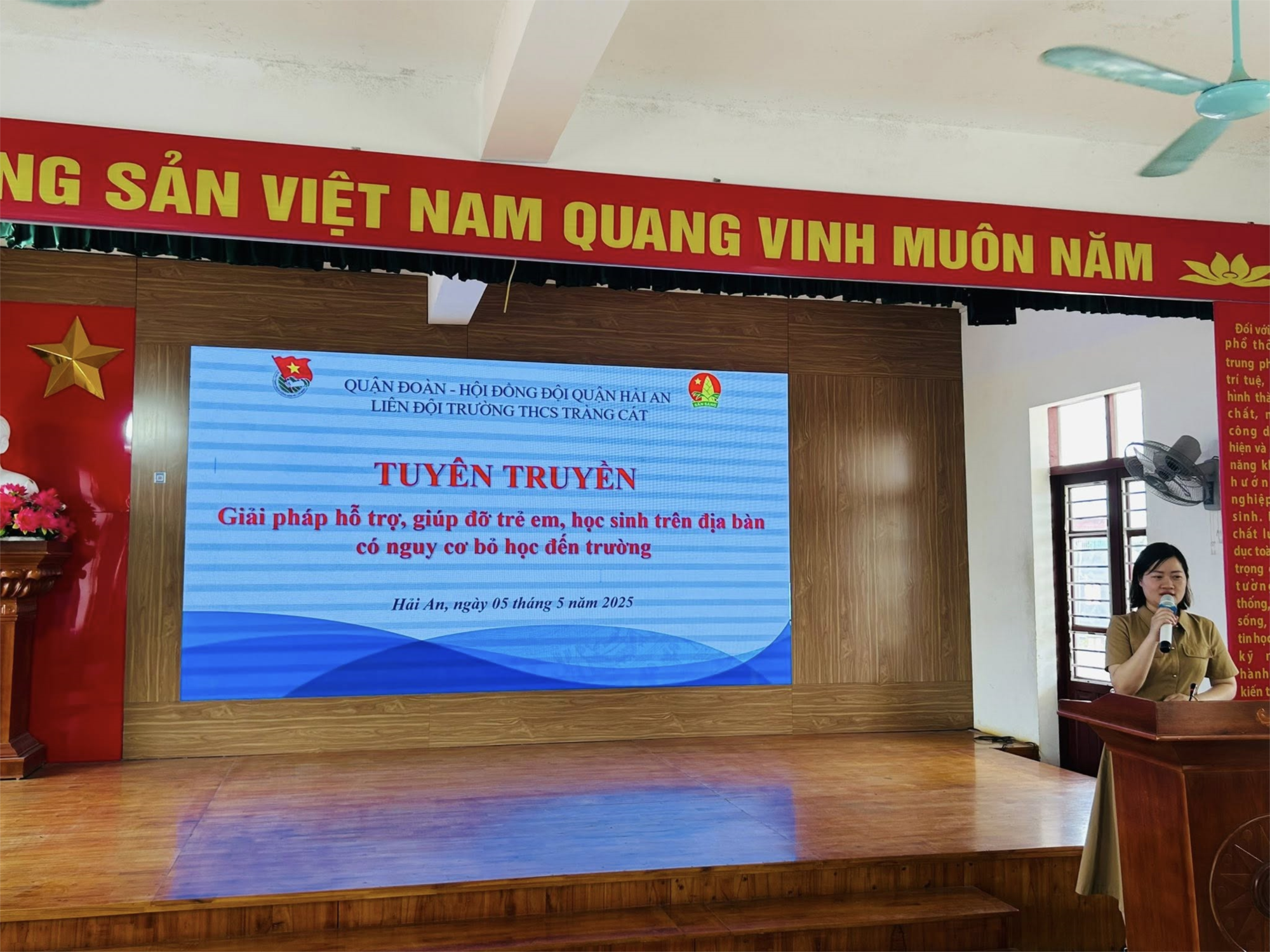 Ngày 5 tháng 5 năm 2025, Liên đội trường THCS Tràng Cát phối hợp với các ban, ngành, đoàn thể địa phương tổ chức buổi tuyên truyền với chủ đề “Giải pháp hỗ trợ trẻ em, học sinh có nguy cơ bỏ học trên địa bàn”. Hoạt động nhằm nâng cao nhận thức của cán bộ, giáo viên, phụ huynh và học sinh về tầm quan trọng của việc duy trì việc học tập liên tục, từ đó chung tay xây dựng môi trường học đường an toàn, thân thiện và giàu tính nhân văn.