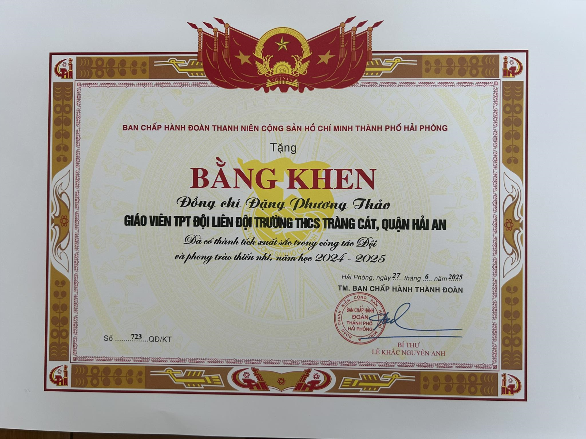 • Đồng chí Đặng Phương Thảo – Giáo viên, TPT Đội được nhận Bằng khen của Ban Chấp hành Đoàn TNCS Hồ Chí Minh thành phố Hải Phòng vì những đóng góp tích cực, tận tâm với công tác Đội.