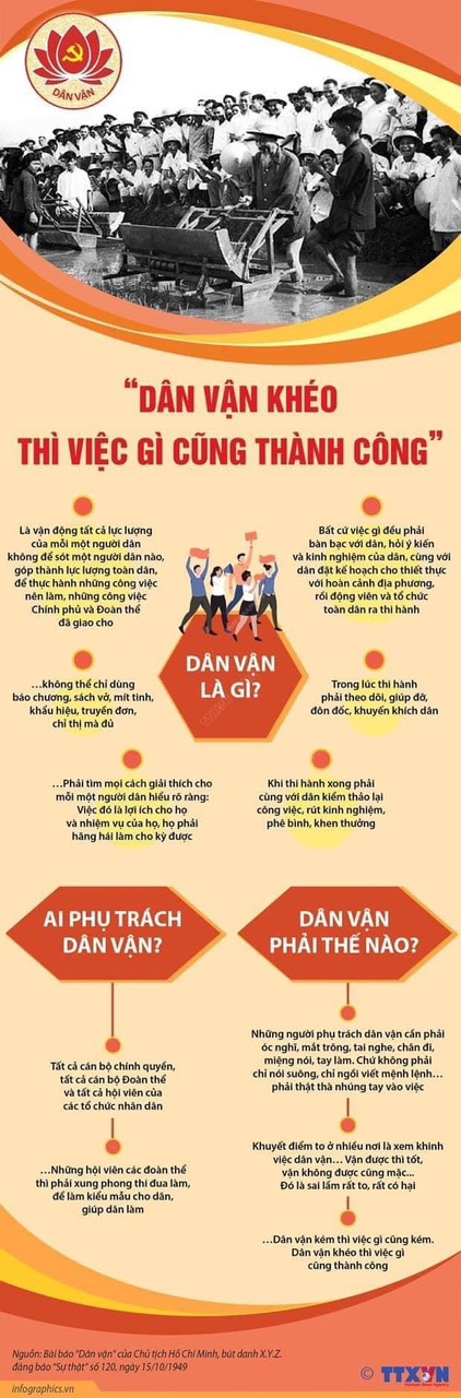 🍀 Ngày 15/10/1949, Chủ tịch Hồ Chí Minh viết tác phẩm “Dân vận” đăng trên báo Sự thật số 120 và đây được xem là cương lĩnh, kim chỉ nam về công tác vận động quần chúng của Đảng.