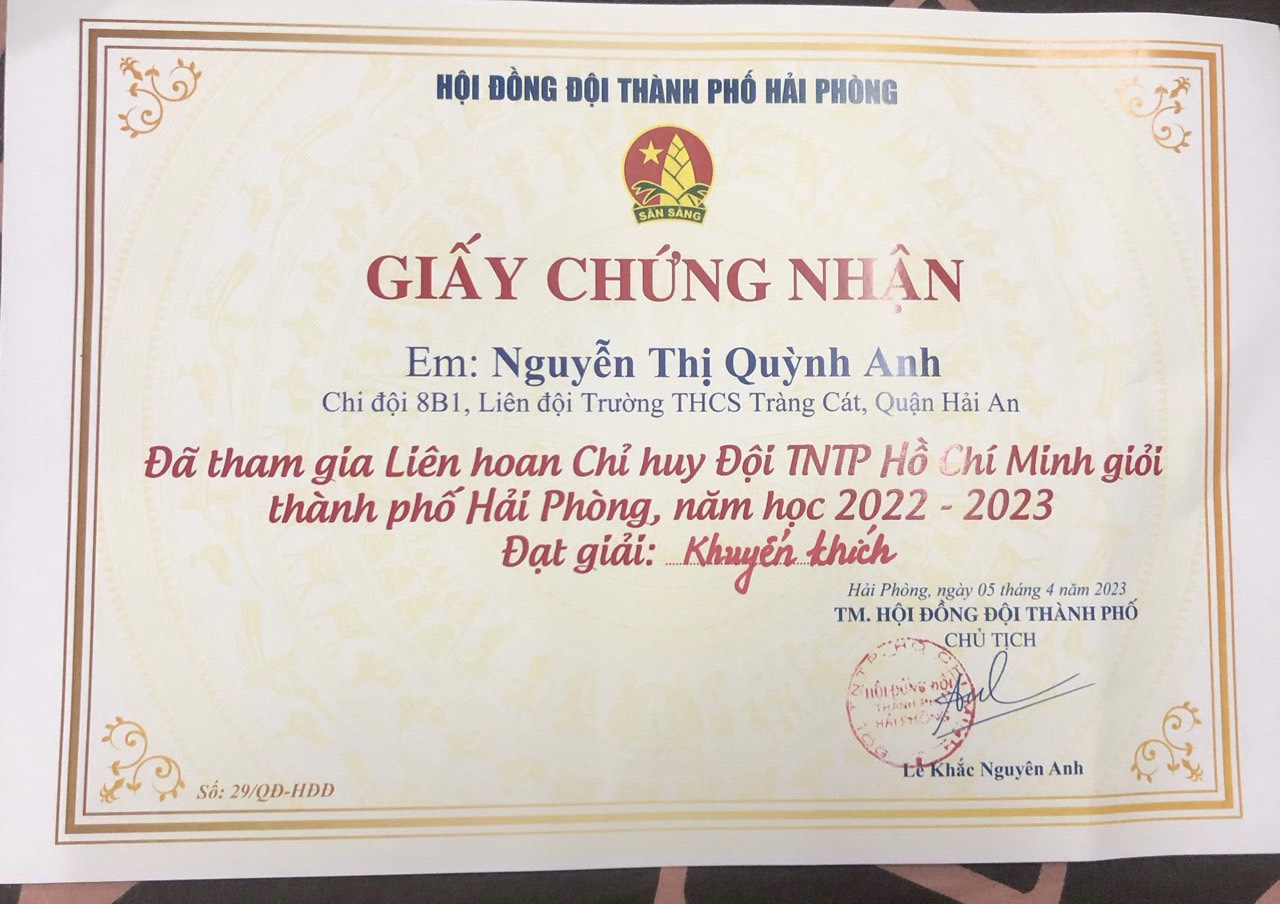 Tham gia Liên hoan, Liên đội THCS Tràng Cát cử đại diện là đội viên Nguyễn Thị Quỳnh Anh - Chi đội trưởng lớp 8B1 - Liên đội trưởng THCS Tràng Cát.