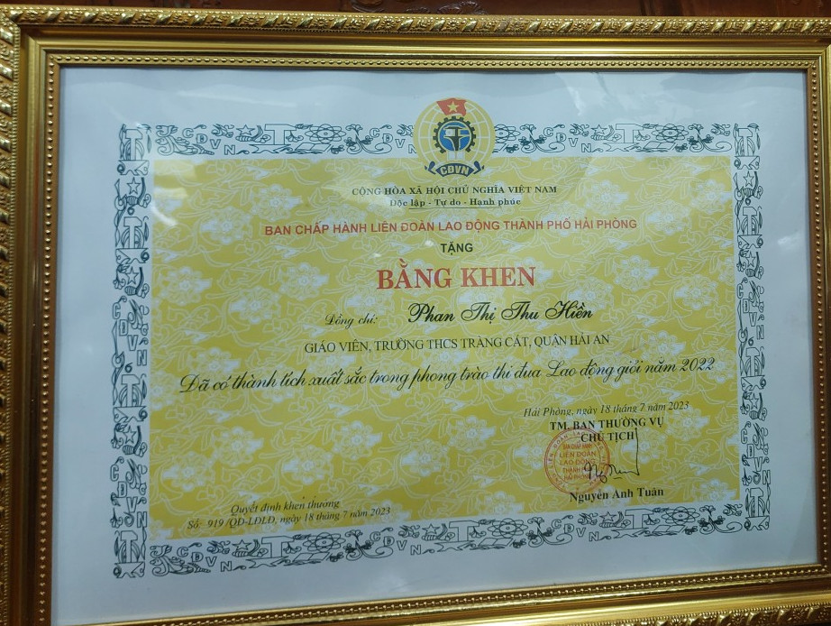 Vinh dự cho nhà trường , đồng chí Phan Thị Thu Hiền được nhận Bằng khen của Ban chấp hành Liên đoàn lao động Thành phố Hải Phòng vì đã có thành tích xuất sắc trong phong trào thi đua Lao động giỏi năm 2022.
