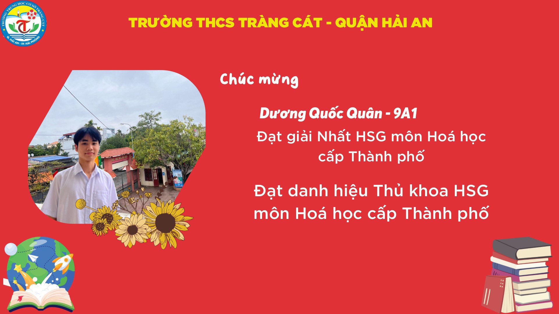 Trong đó có 01 HS đạt danh hiệu Thủ khoa môn Hoá 9,50: em Dương Quốc Quân-lớp 9A1- Là thủ khoa duy nhất của quận Hải An.