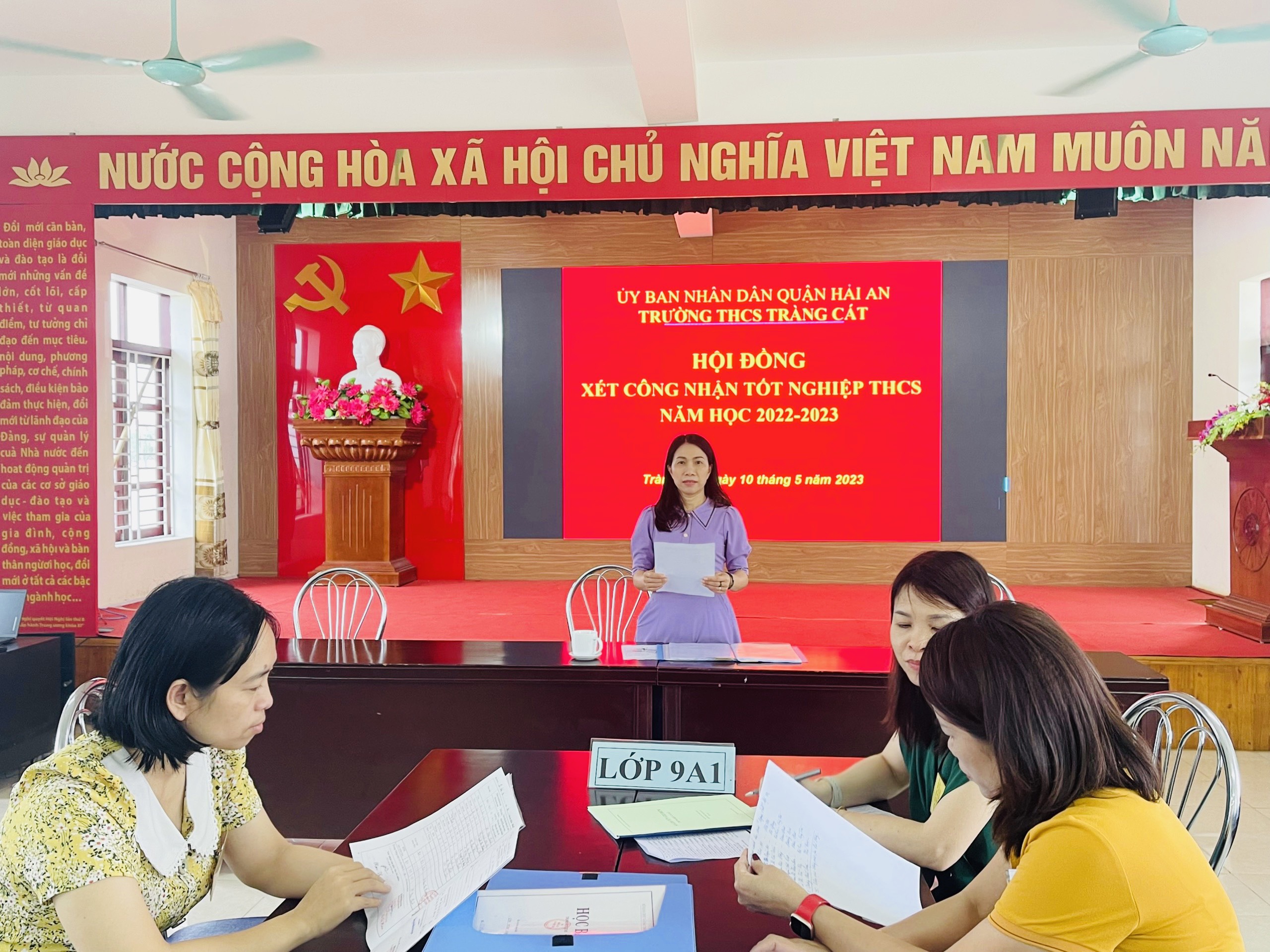 Thực hiện quyết định số 1027/QĐ-UBND ngày 05 tháng 5 năm 2023 của UBND quận Hải An về việc thành lập các hội đồng xét công nhận tốt nghiệp THCS Trường THCS Tràng Cát năm học 2022-2023